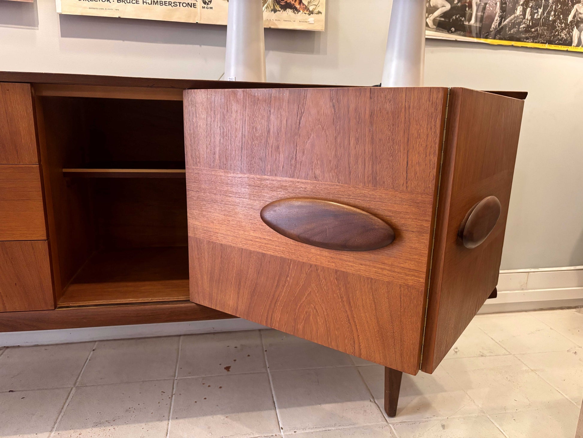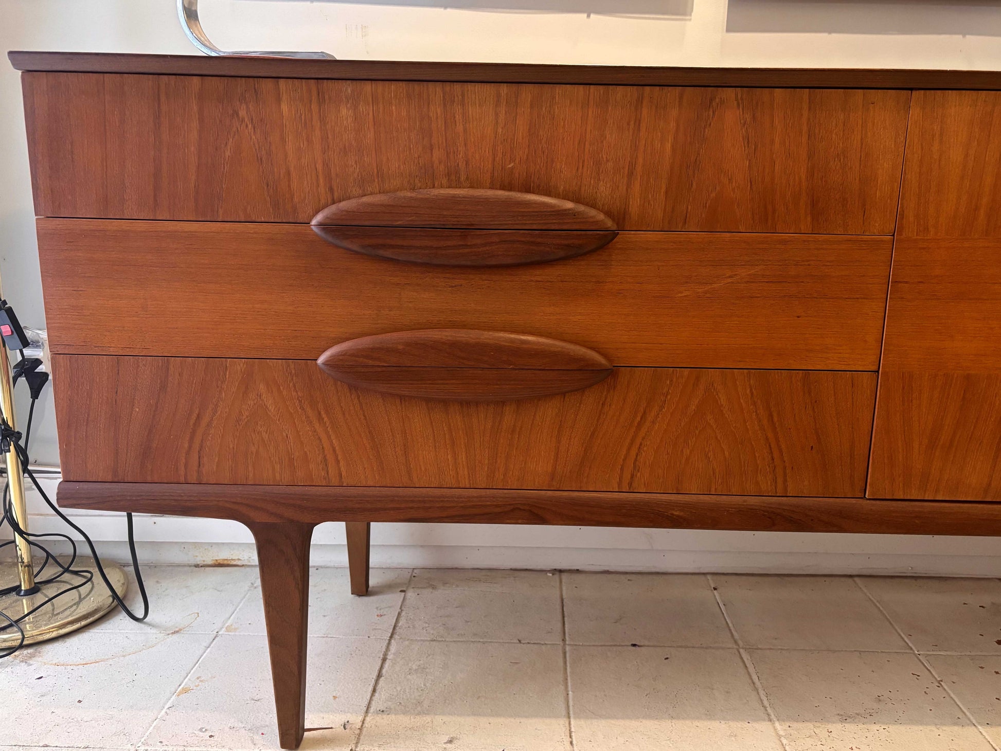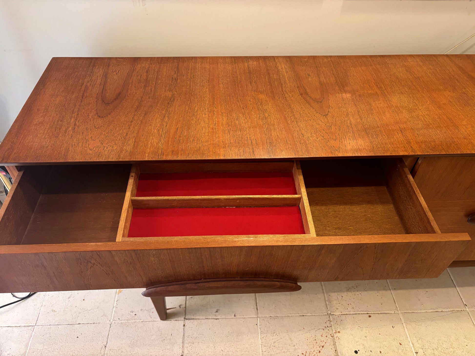 Aparador de teca con dos cuerpos, puerta corredera y cubertero de fieltro deslizable.