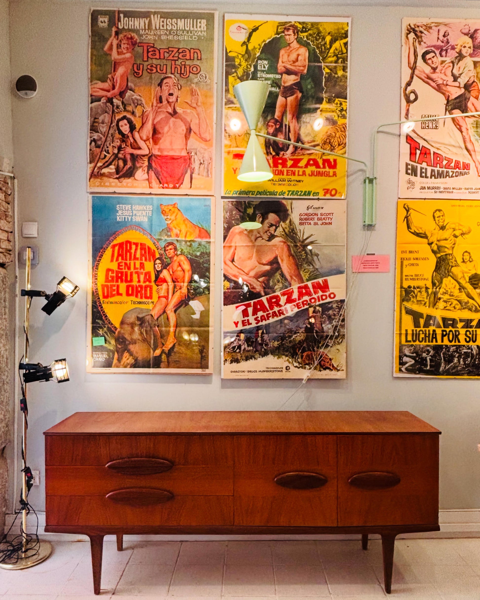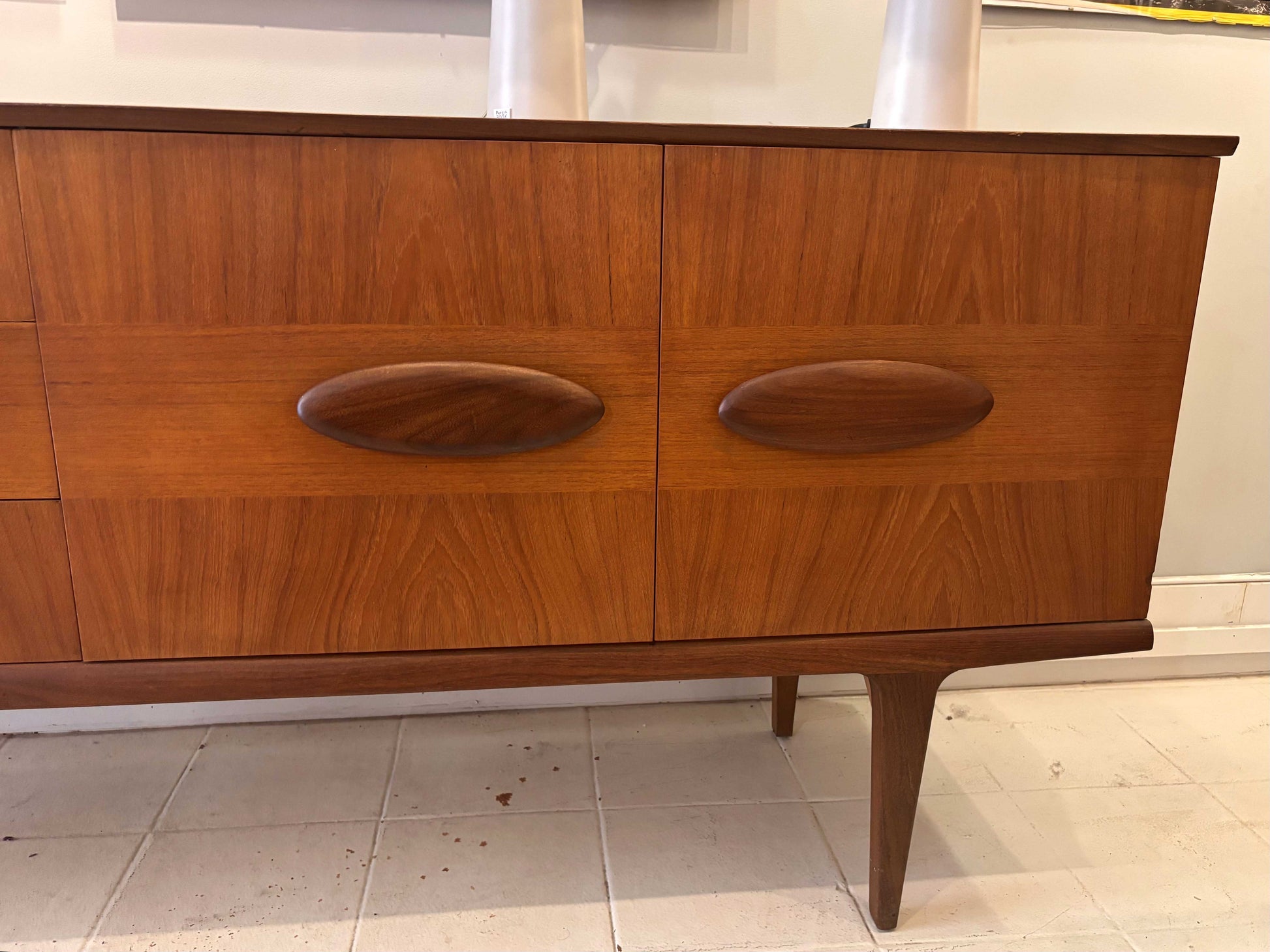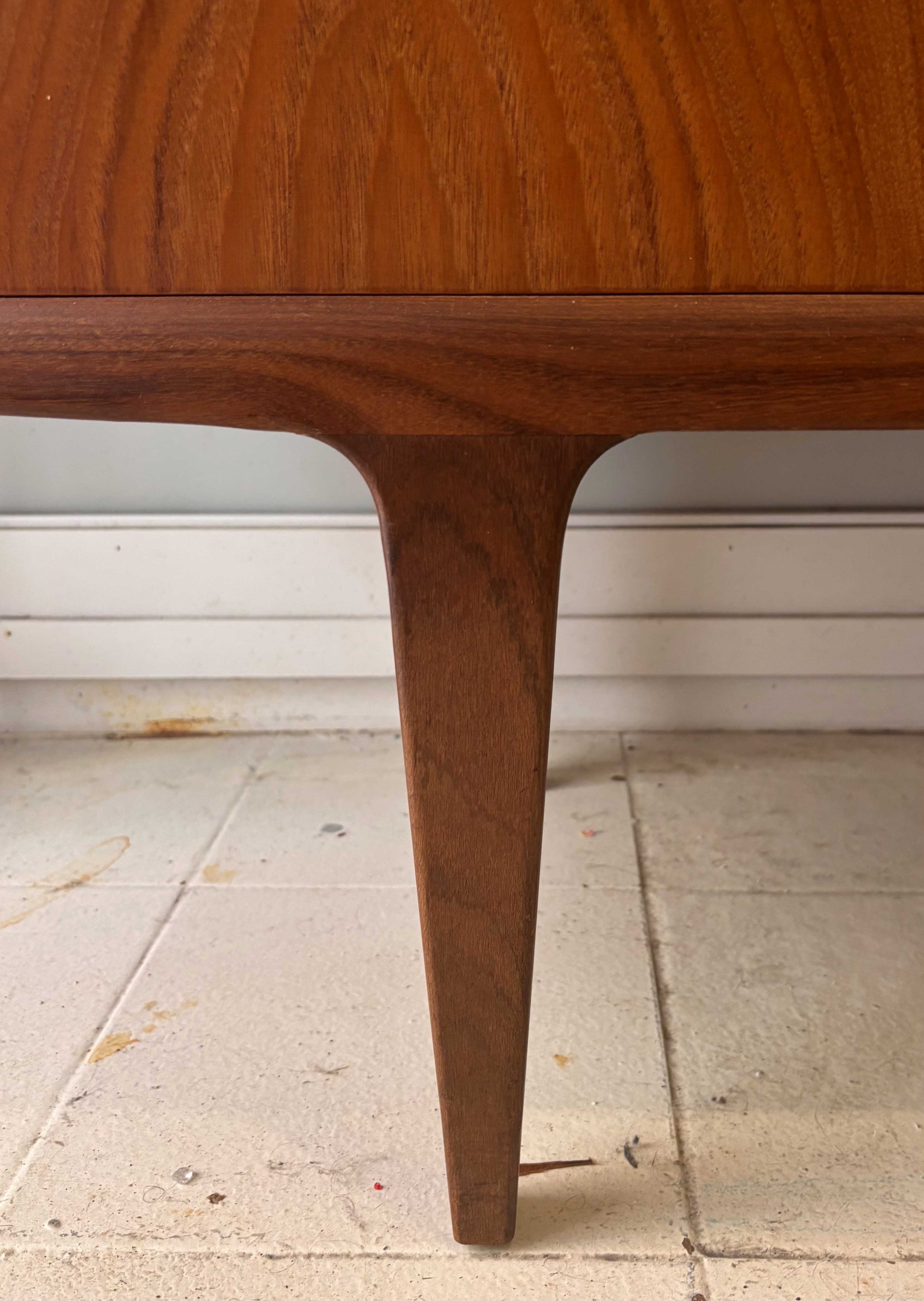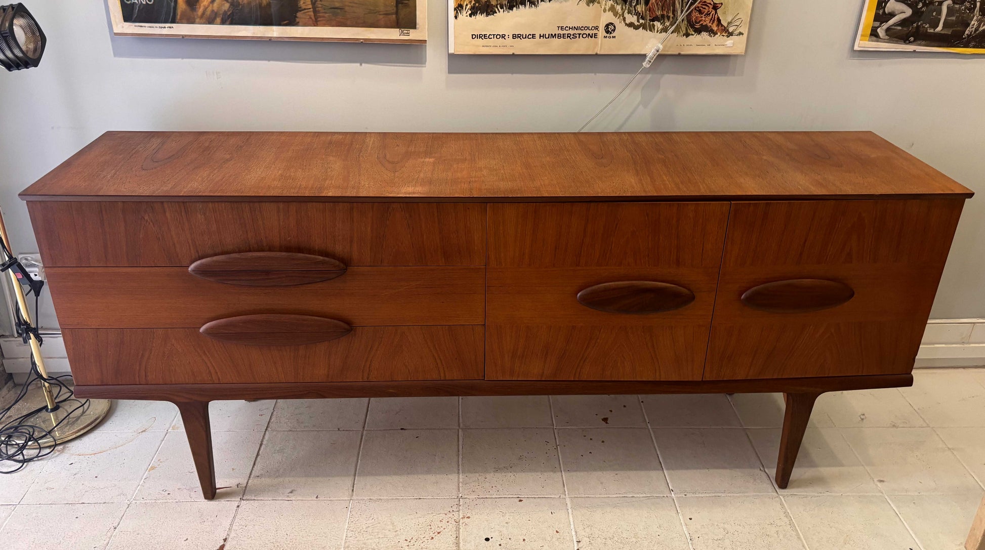 Aparador de teca con dos cuerpos, puerta corredera y cubertero de fieltro deslizable.